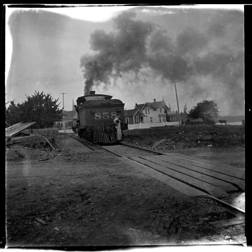 Negative, sheet film. 3.5 x 3.5 b&w. Train. Port Townsend Southern rail spur to Olympia brewery. Photo shows engine, tender, and houses in lower Tumwater (near today's Crosby House).Other Names and Numbers