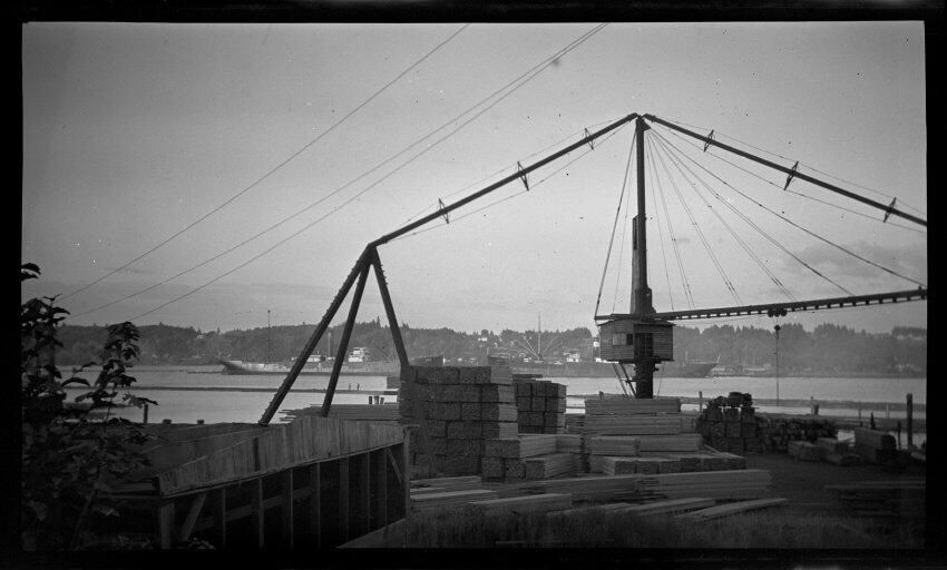 Negative, sheet film. 2.5 x 4.5 b&w. Construction materials at dock, probably in Olympia.