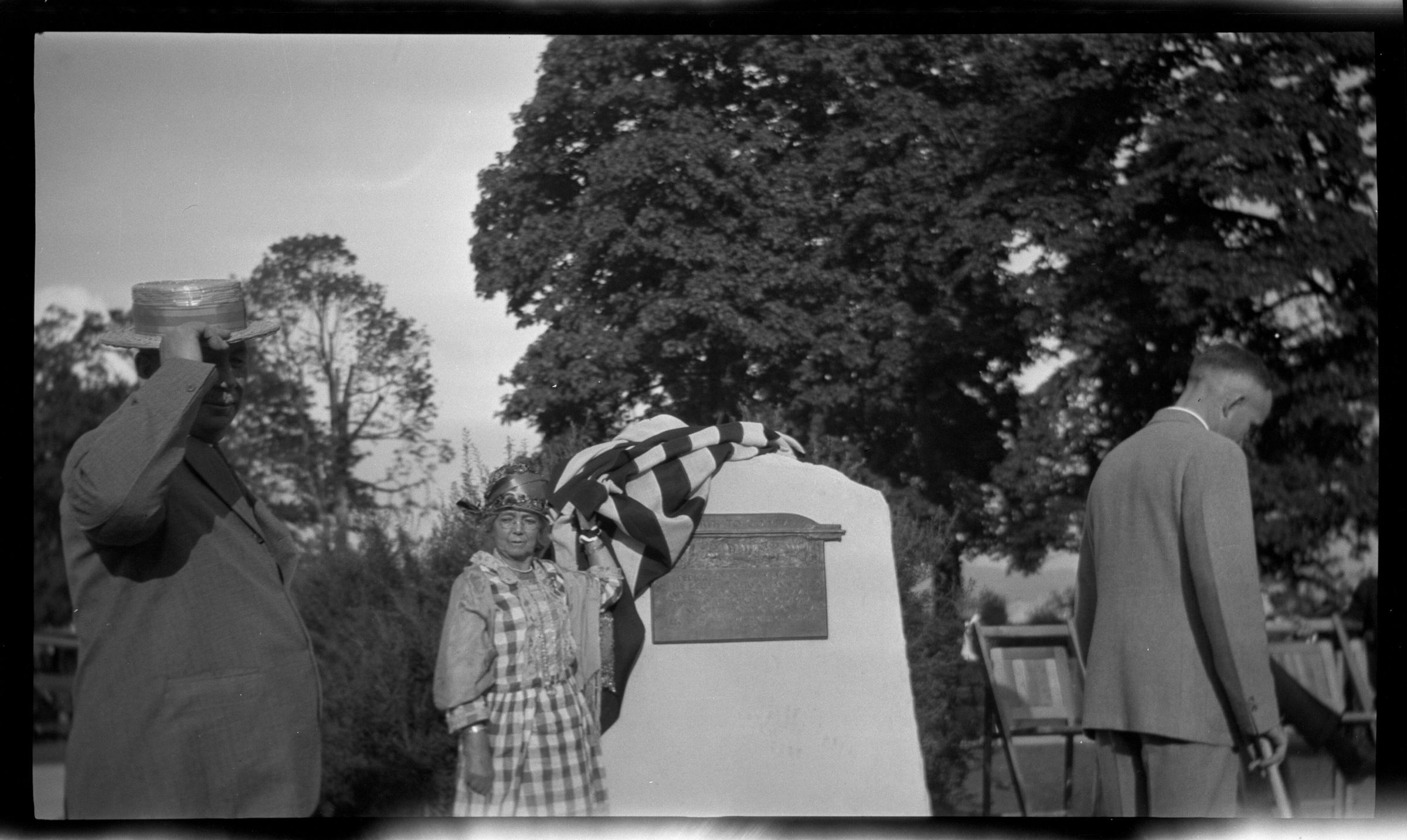 Negative, sheet film. 2.5 x 4.5 b&w. Dedication of monument in Longview WA. Bronze plaque designed by sculptor Alonzo Victor Lewis. Plaque reads: "North to Olympia. Dedicated to the memory of the early settlers of Monticello and those pioneers who blazed their way through to Olympia, 'The End of the Oregon Trail.' Erected by the Kiwanis Club of Olympia July 1926."