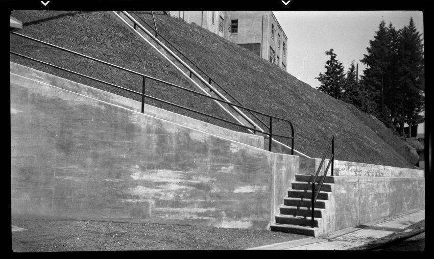 Negative, sheet film. 2.5 x 4.5 b&w. Concrete retaining wall, stairway, and steep slope at Olympia brewery.