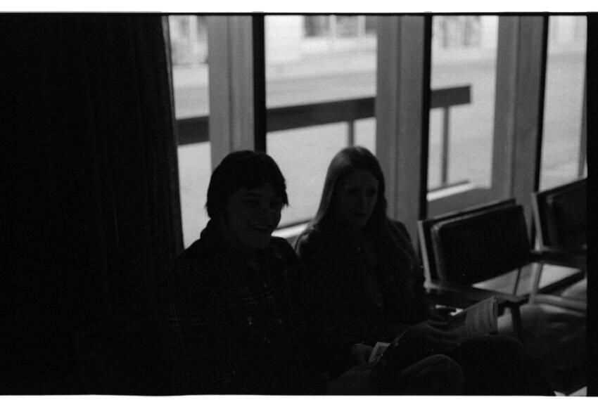 Negative, sheet film. 1 x 1.5 b&w. OBC. Unidentified visitors at brewery.