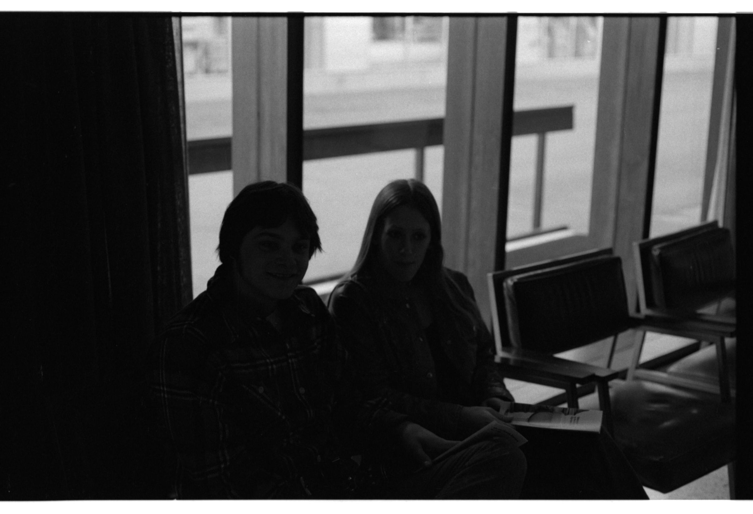 Negative, sheet film. 1 x 1.5 b&w. OBC. Unidentified visitors at brewery.