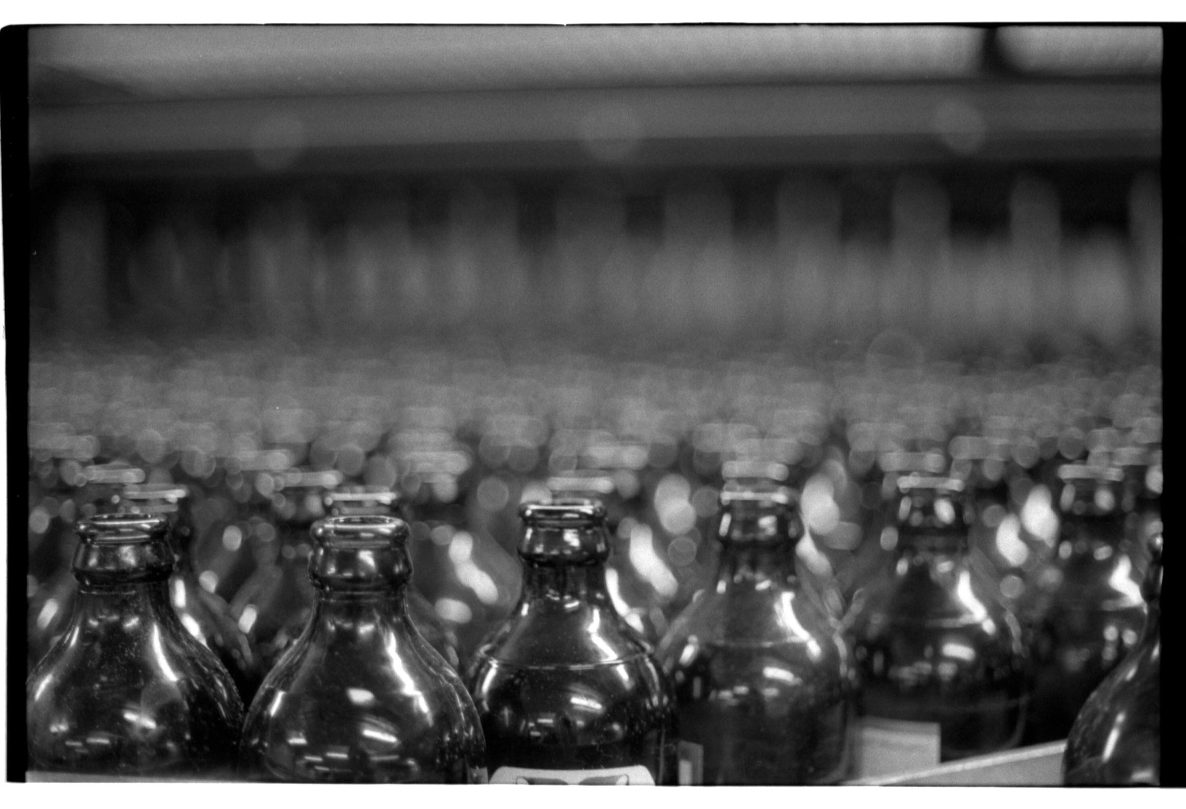 Negative, sheet film. 1 x 1.5 b&w. OBC. Bottlers going into a soaker.