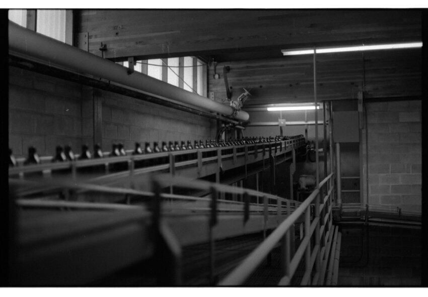 Negative, sheet film. 1 x 1.5 b&w. OBC. Empty bottles heading to washer or rinser.