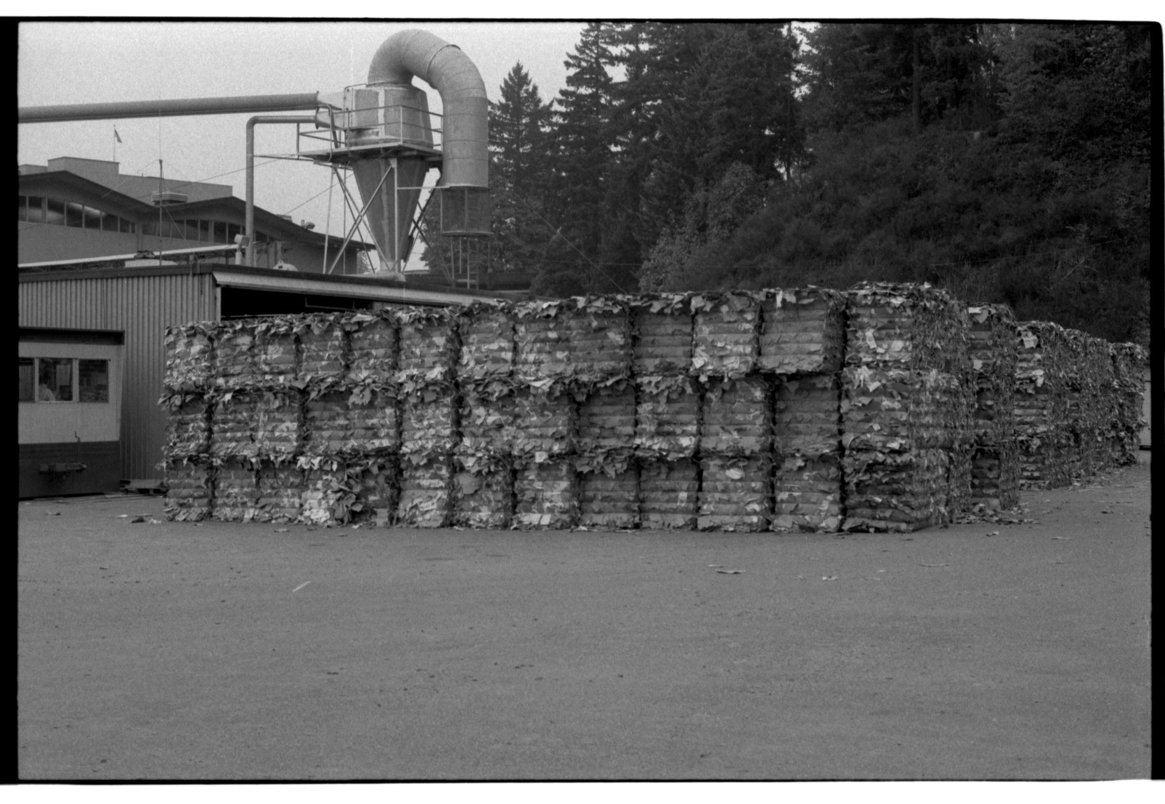Negative, sheet film. 1 x 1.5 b&w. OBC recycling area. Bales of cartons, boxes, etc.