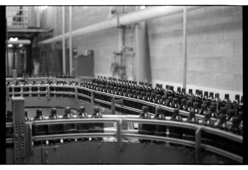 Negative, sheet film. 1 x 1.5 b&w. OBC. Empty bottles heading to rinser or washer