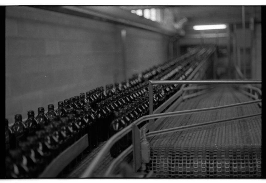 Negative, sheet film. 1 x 1.5 b&w. OBC. Empty bottles heading to rinser or washer