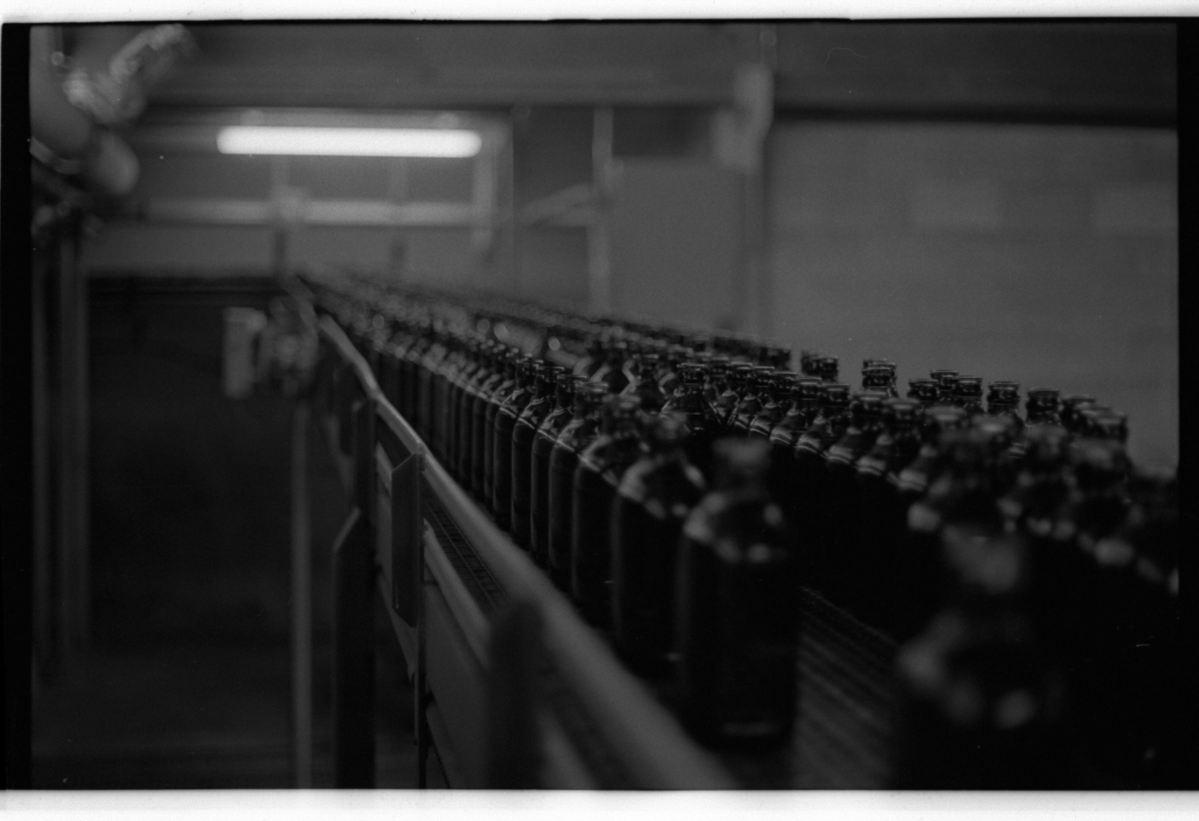 Negative, sheet film. 1 x 1.5 b&w. OBC. Empty bottles heading to rinser or washer