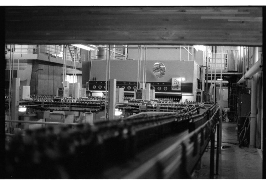 Negative, sheet film. 1 x 1.5 b&w. OBC. Pasteurizer in background.