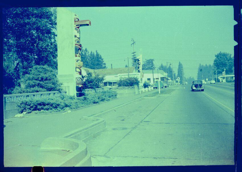 Negative, sheet film. 1.15 x 1.6 b&w. Carlyon (Capitol Boulevard) Bridge was completed in 1938. The bridge and its totem poles and pylons were originally plain cast concrete, but in 1951, Peter G. Schmidt had the totems and pylons painted in bright colors to attract more interest. This photo is looking north, and shows the restaurant at the north end of the bridge.Name/Title