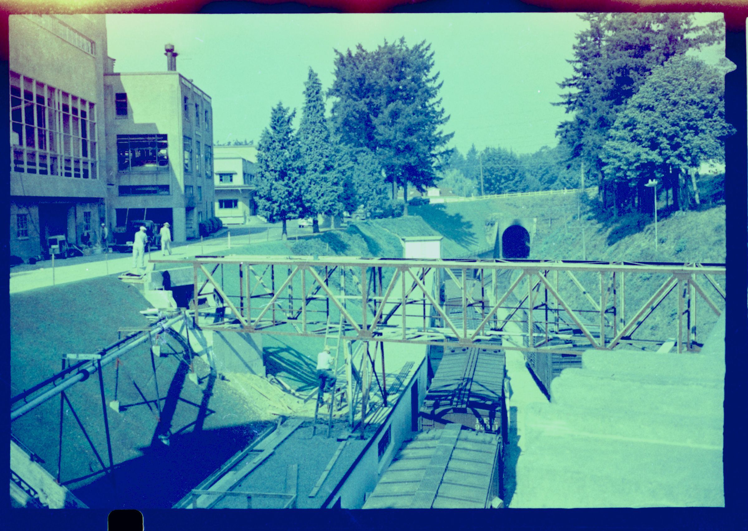 Negative, sheet film. 1.15 x 1.6 b&w. Olympia Brewing Company showing the east side of complex and railroad tracks. Building catwalk/pipe and conveyor tunnel to bottleshop and keg loading area.