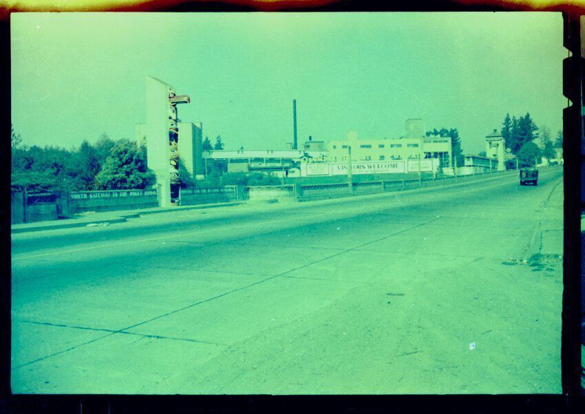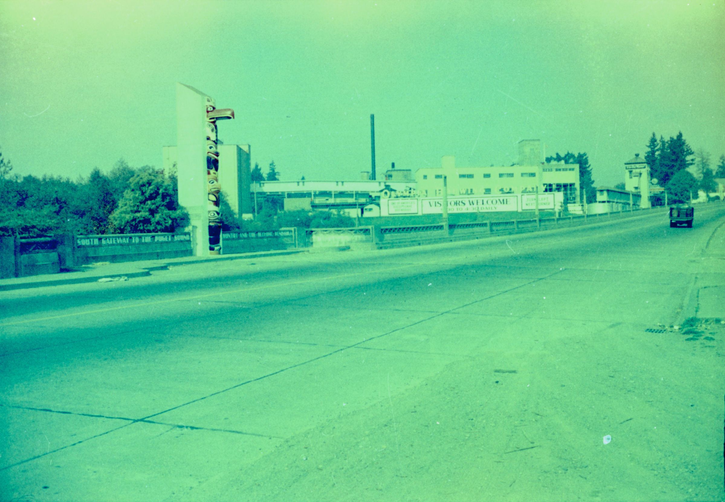 Negative, sheet film. 1.15 x 1.6 b&w. Olympia Brewing Company in the distance, and Carlyon Bridge in the middle ground. View looking north-northwest.