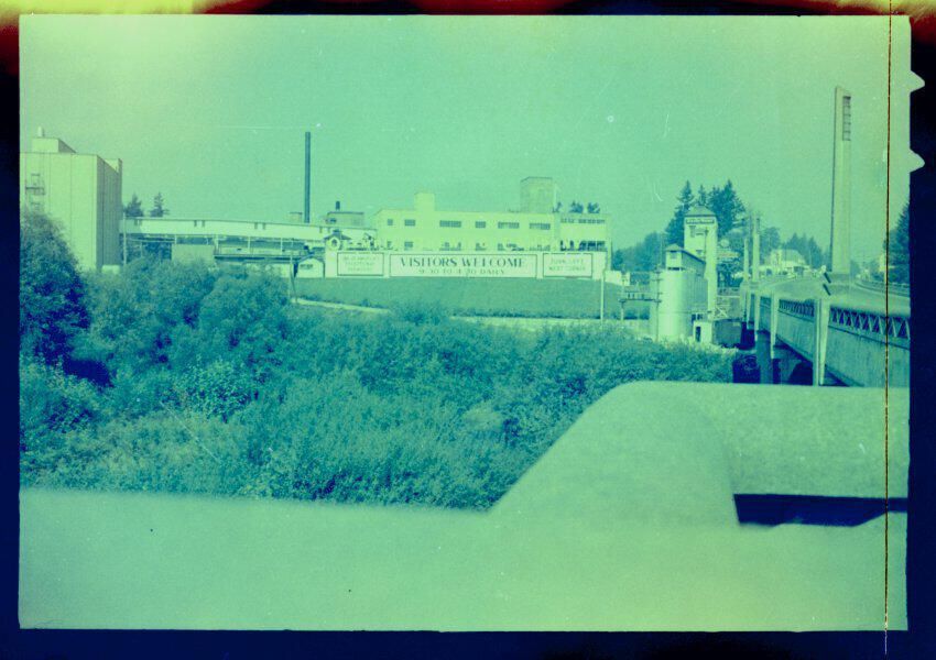 Negative, sheet film. 1.15 x 1.6 b&w. Olympia Brewing Company viewed from the south. Carlyon Bridge at far right.