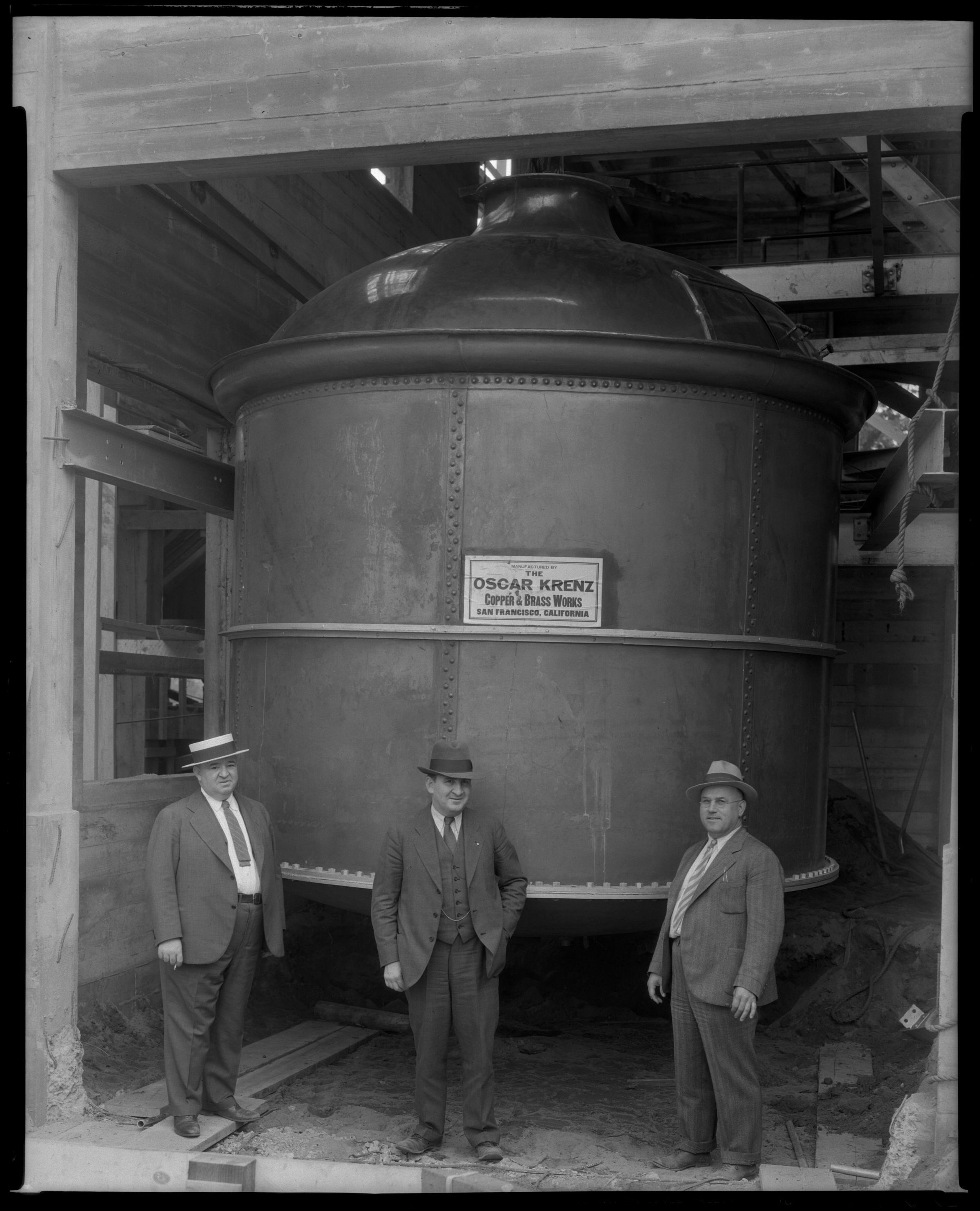 Negative, sheet film. 10 x 8 b&w. Installation of new copper brew kettle at Olympia brewery. This kettle for many years was on display (non-working) in hospitality room of brewery, and now sits in front of Tumwater City Hall. Left to right: Ted Tucker, first OBC marketing man post-Prohibition; Adolph Schmidt Sr.; unk.Name/Title