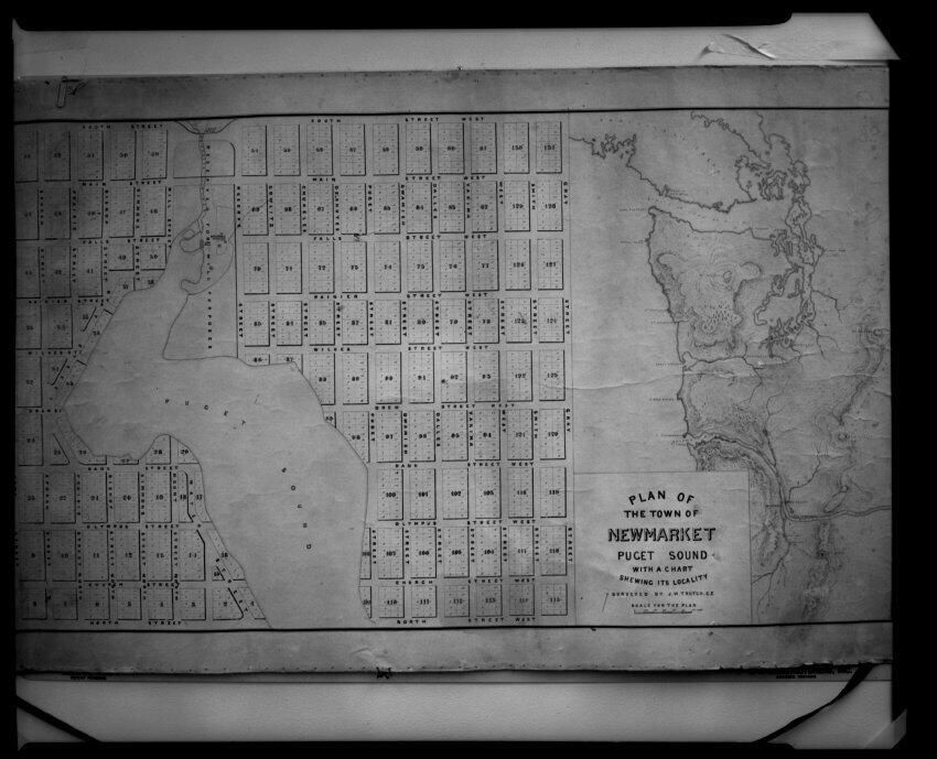 Negative, sheet film. 4 x 5 b&w. Photo of plat for town of New Market (original name of Tumwater). Plat was drawn up between 1845 and 1857, when town became known as Tumwater.
