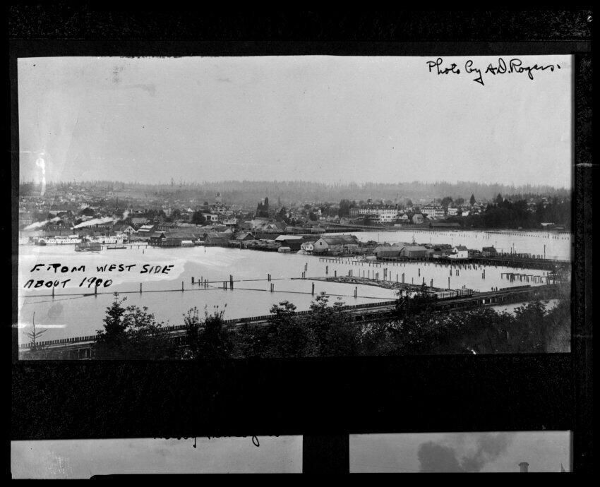Negative, sheet film. 4 x 5 b&w. Olympia from west side, about 1900. View looking east. Shows 4th Avenue bridge and waterfront. Large white building just to right of center is the Hotel Olympia. Photo by A. D. Rogers.Name/Title