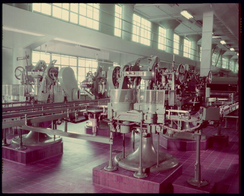 Negative, sheet film. 4 x 5 positive. A bottlehouse showing labelers.