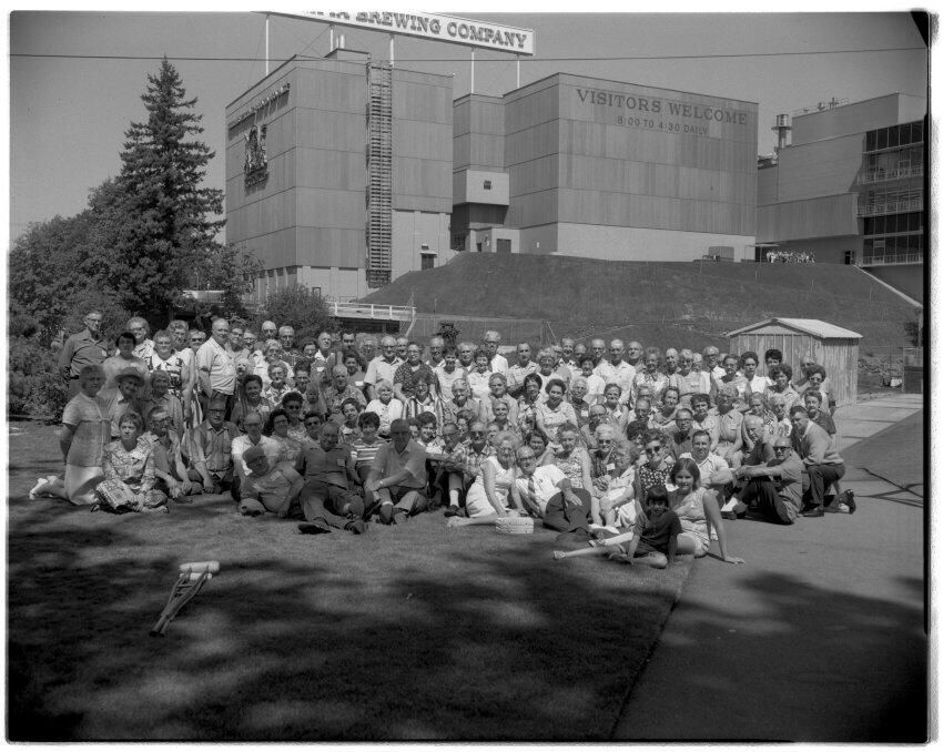 Negative, sheet film. 4 x 5 b&w. No. 238. Olympia brewery old timers picnic at Tumwater Falls Park. No ID on people.