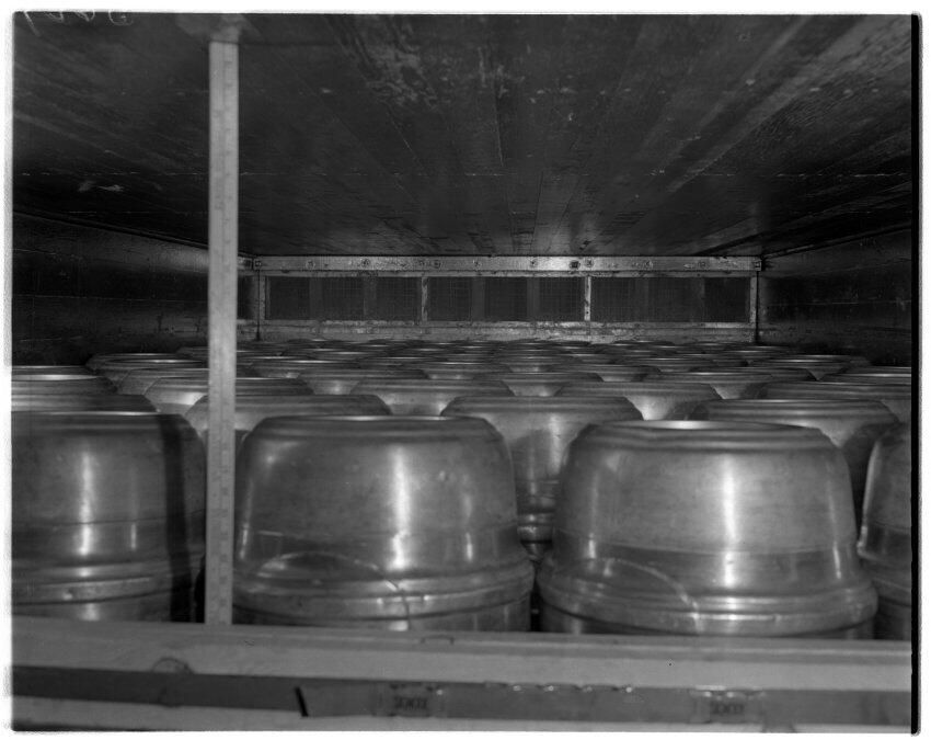 Negative, sheet film. 4 x 5 b&w. Loading beer kegs on Northern Pacific railcar at Olympia brewery.