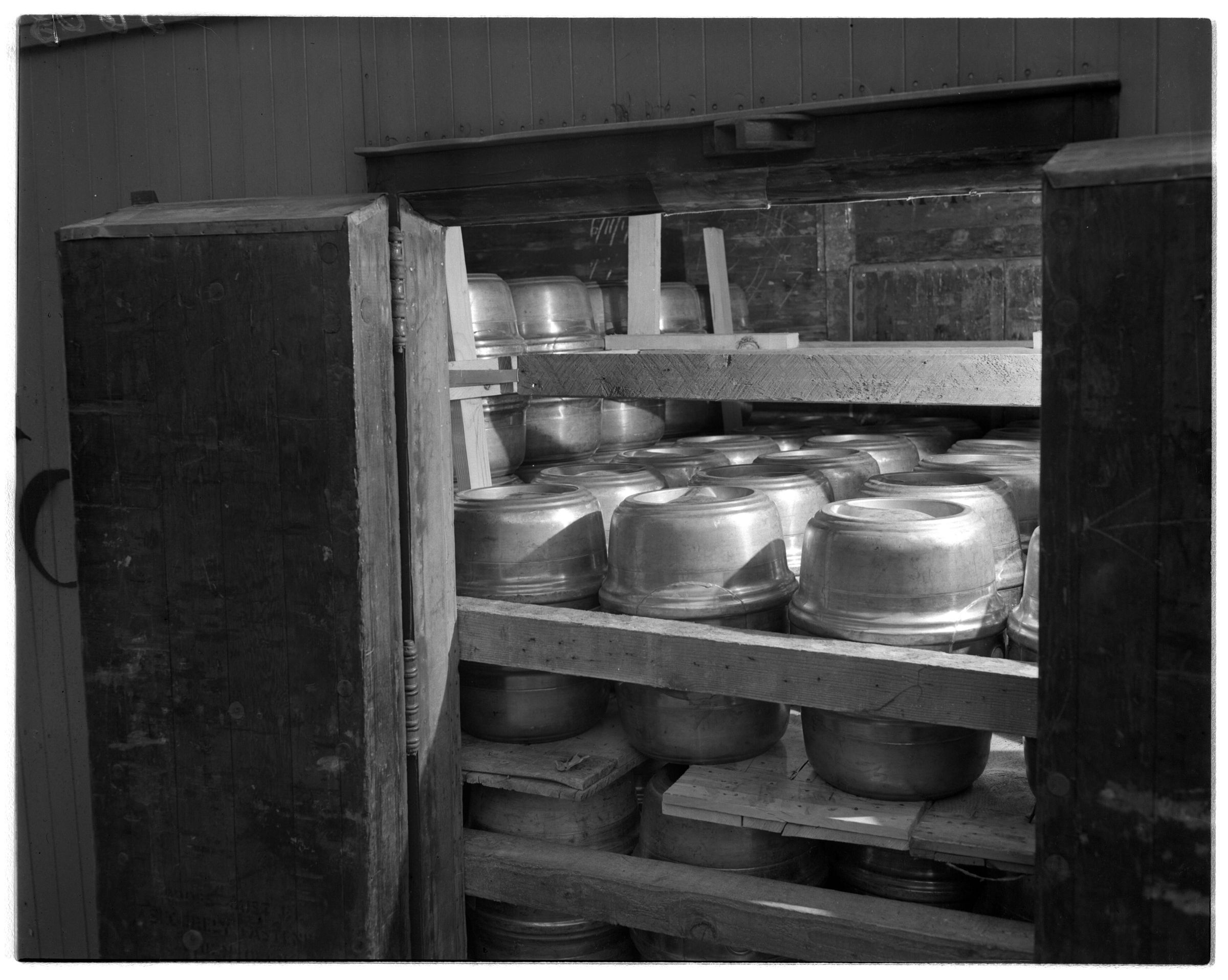 Negative, sheet film. 4 x 5 b&w. Loading beer kegs on Northern Pacific railcar at Olympia brewery.