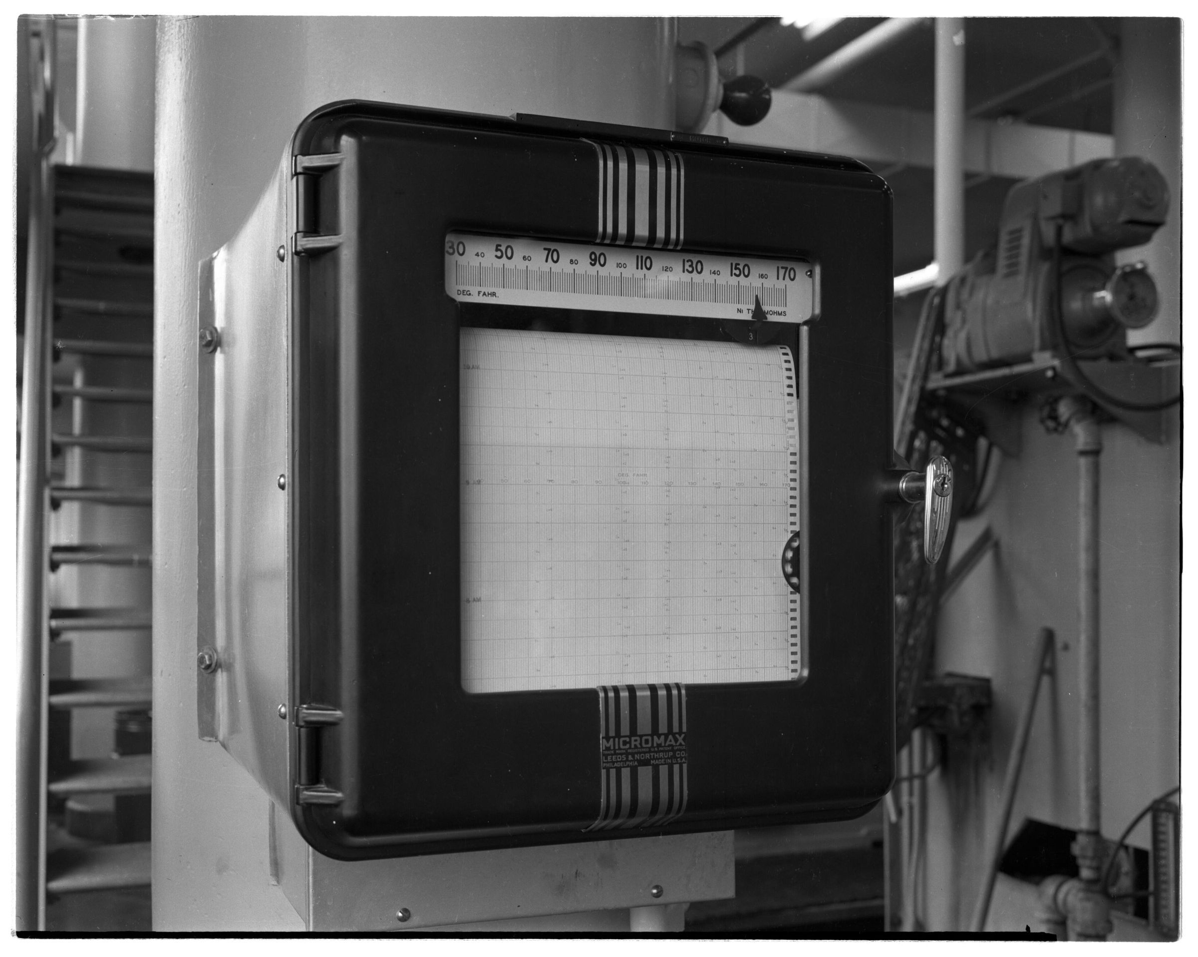 Negative, sheet film. 4 x 5 b&w. No. 2643. Olympia Brewing Co. Bottling Plt. Unidentified equipment, possibly monitoring pasteurizer temperatures.