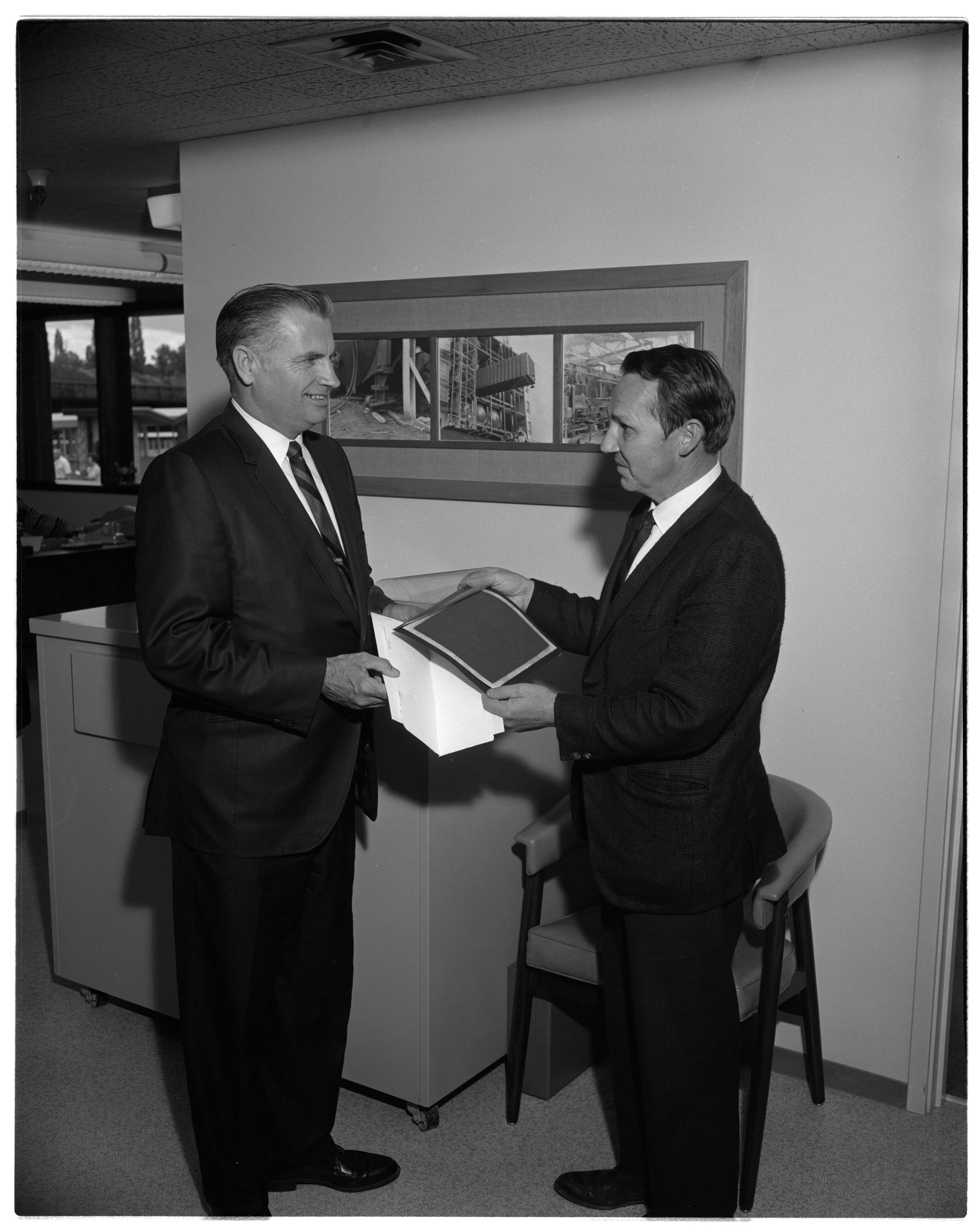 Negative, sheet film. 4 x 5 b&w. No. 7110. No ID on man on left. Skip Schmidt on right.