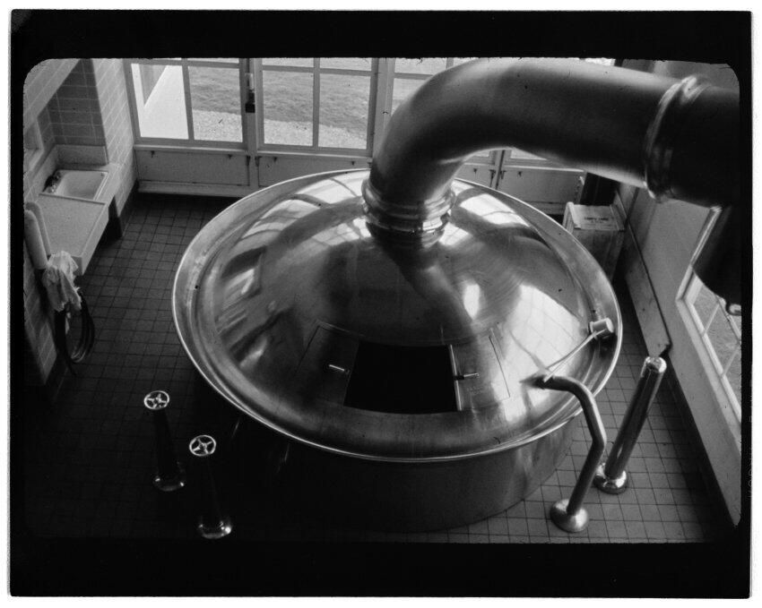 Negative, sheet film. 4 x 5 b&w. No. 6645E. Olympia Brewery. Brew kettle, probably #4 in A brewhouse.
