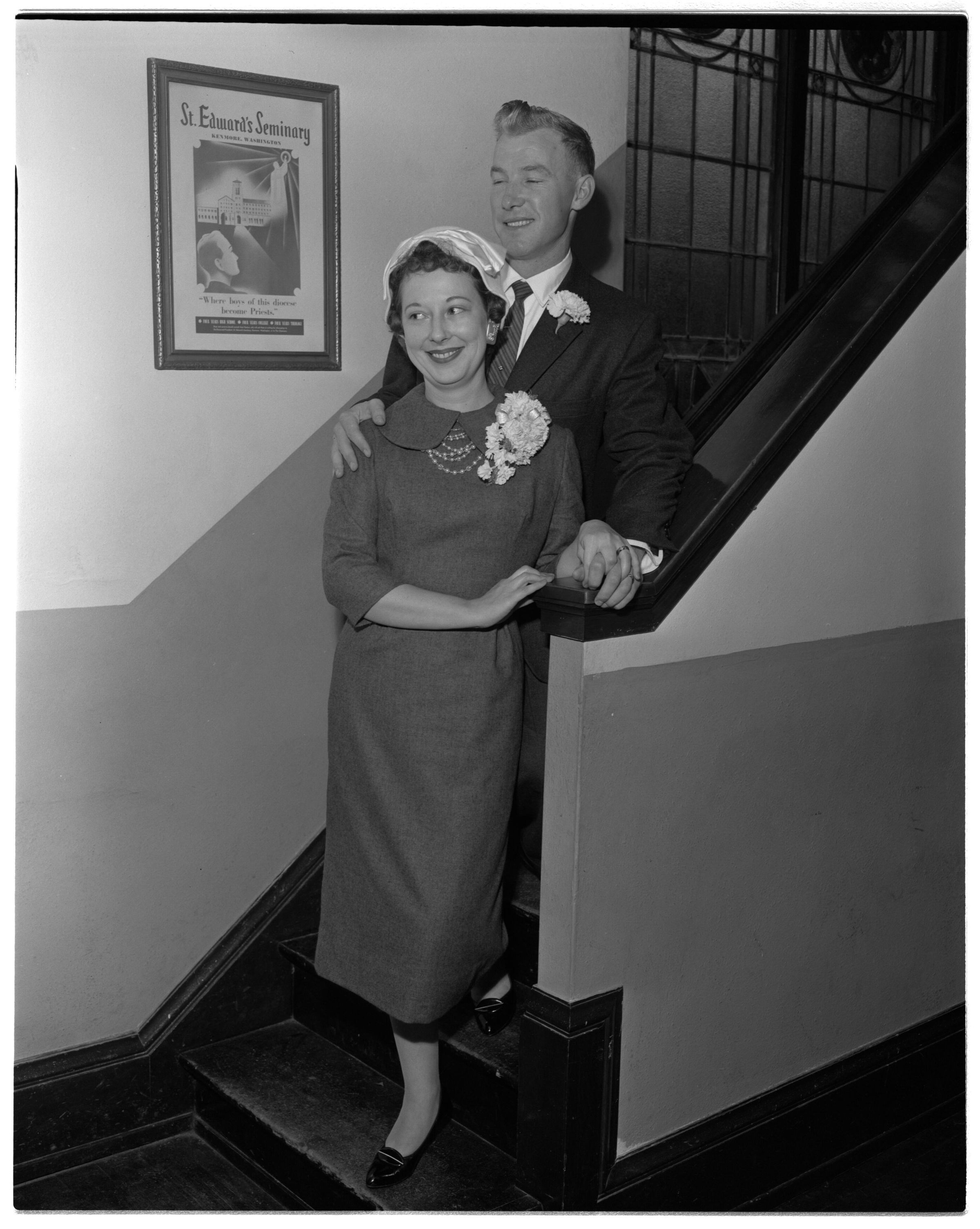 Negative, sheet film. 4 x 5 b&w. No. 2646. Olympia Beer Co. Wedding picture of Louis F. Deschamps and Geraldine McDonald. Louis was an OBC employee.