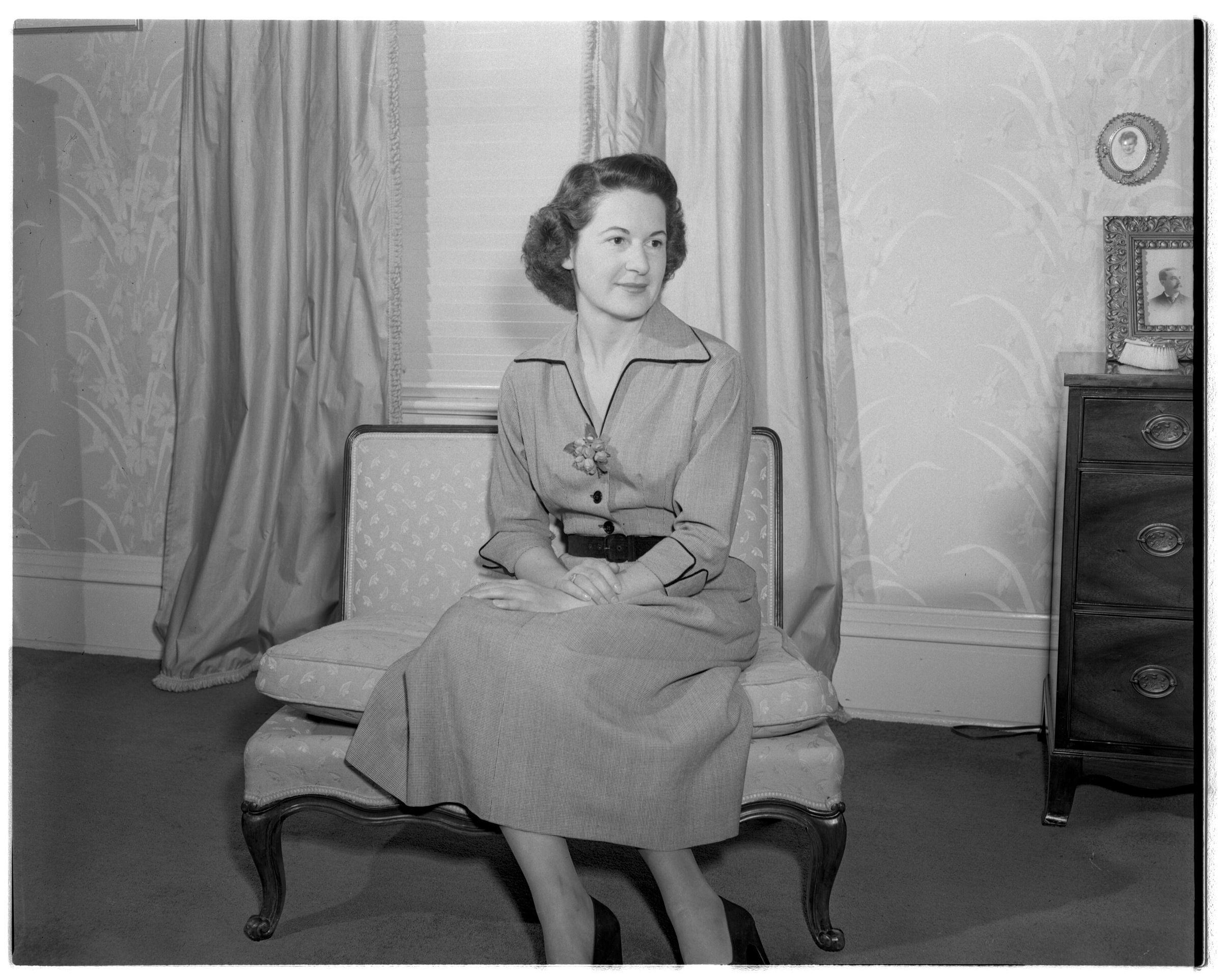 Negative, sheet film. 4 x 5 b&w. No. 2656. Margaret Gradie Schmidt Runnalls at Schmidt House.