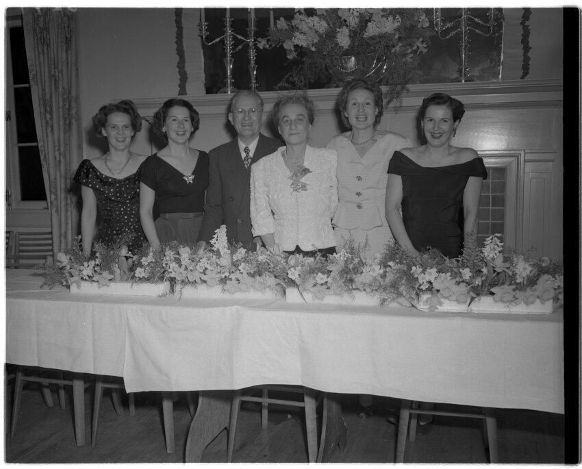 Negative, sheet film. 4 x 5 b&w. No. 2656. Celebrating Peter G. Schmidt's 70th birthday, unknown location. Left to right: Alice, Gradie, Peter, Clara, Nootchie, Sis.