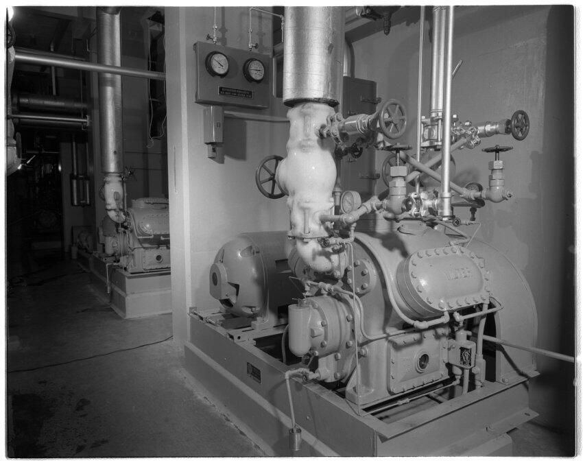 Negative, sheet film. 4 x 5 b&w. No. 676. W. E. Stone and Co. 1330 Dearborn St. Seattle. Refrigeration Plt. at Oly Brewery. One of several ammonia compressors in M-2 cellar. Ammonia was used to cool CO2 to a liquid state for storage. CO2 was then used to carbonate the beer and to displace oxygen in tanks.Name/Title