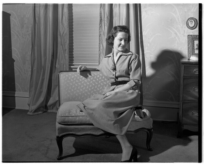 Negative, sheet film. 4 x 5 b&w. No. 2656. Margaret Gradie Schmidt Runnalls at Schmidt House.