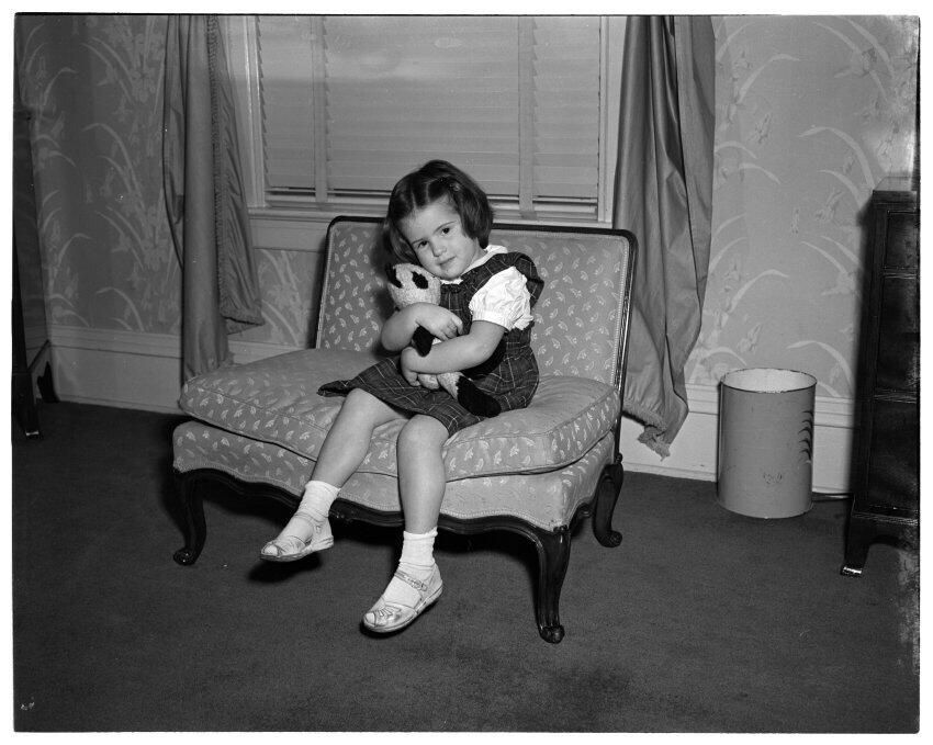 Negative, sheet film. 4 x 5 b&w. No. 2656. Susan Patty Runnalls, daughter of Margaret Gradie Schmidt Runnalls and Johnnie Runnalls, at Schmidt House.