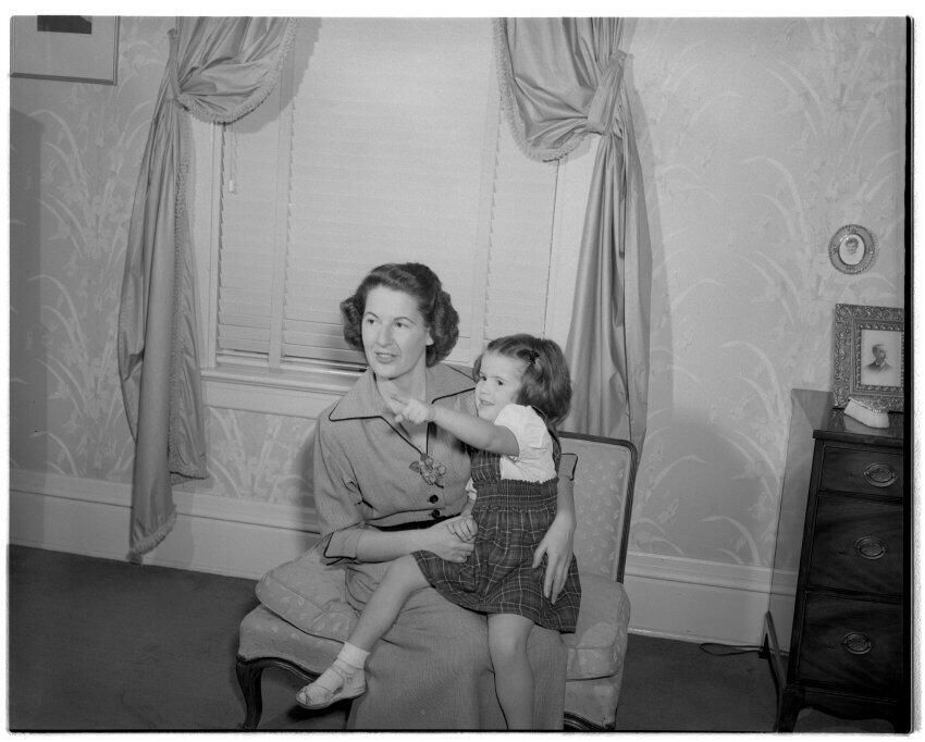 Negative, sheet film. 4 x 5 b&w. No. 2656. Margaret Gradie Schmidt Runnalls and daughter Susan at Schmidt House.