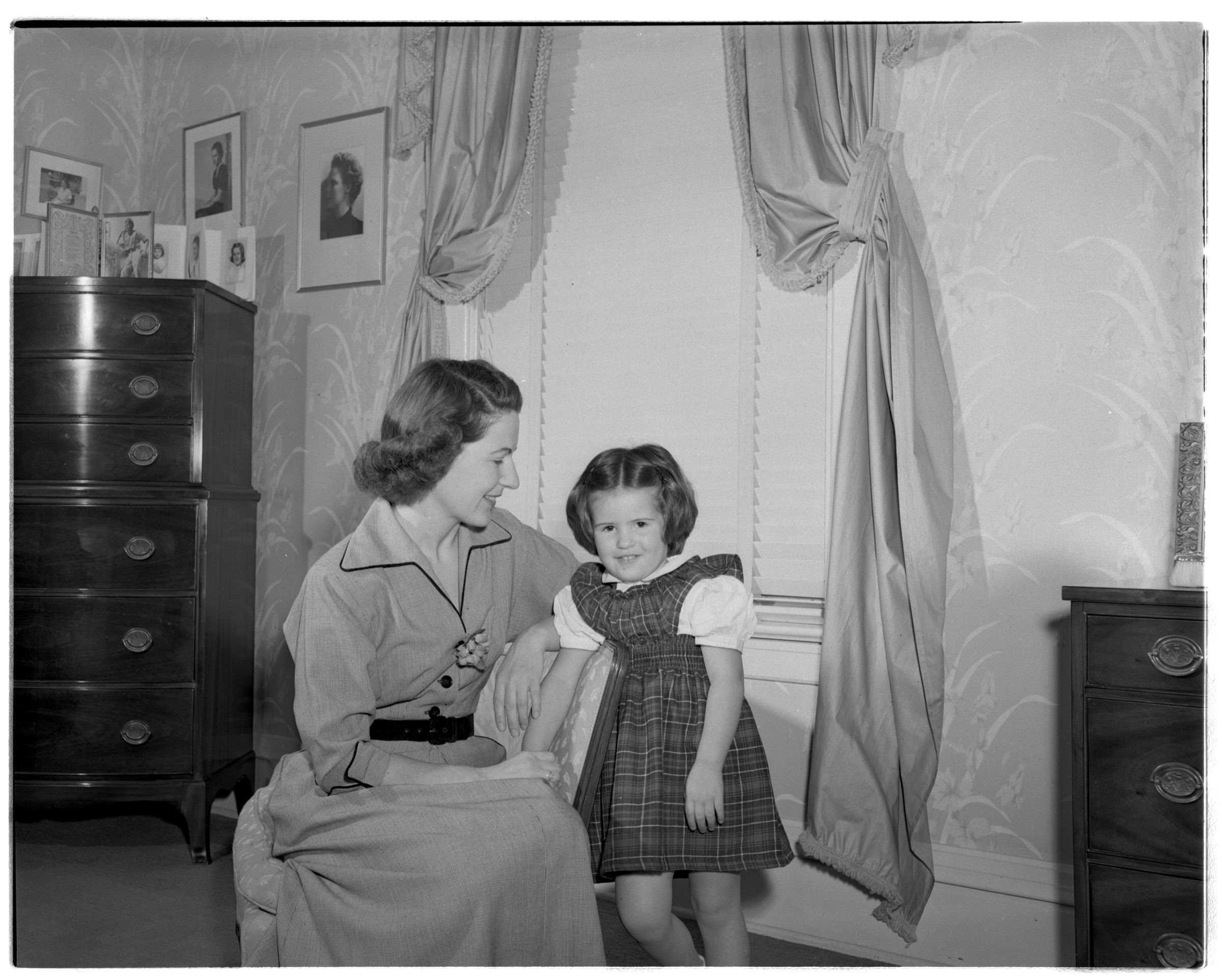 Negative, sheet film. 4 x 5 b&w. No. 2656. Margaret Gradie Schmidt Runnalls and daughter Susan at Schmidt House.