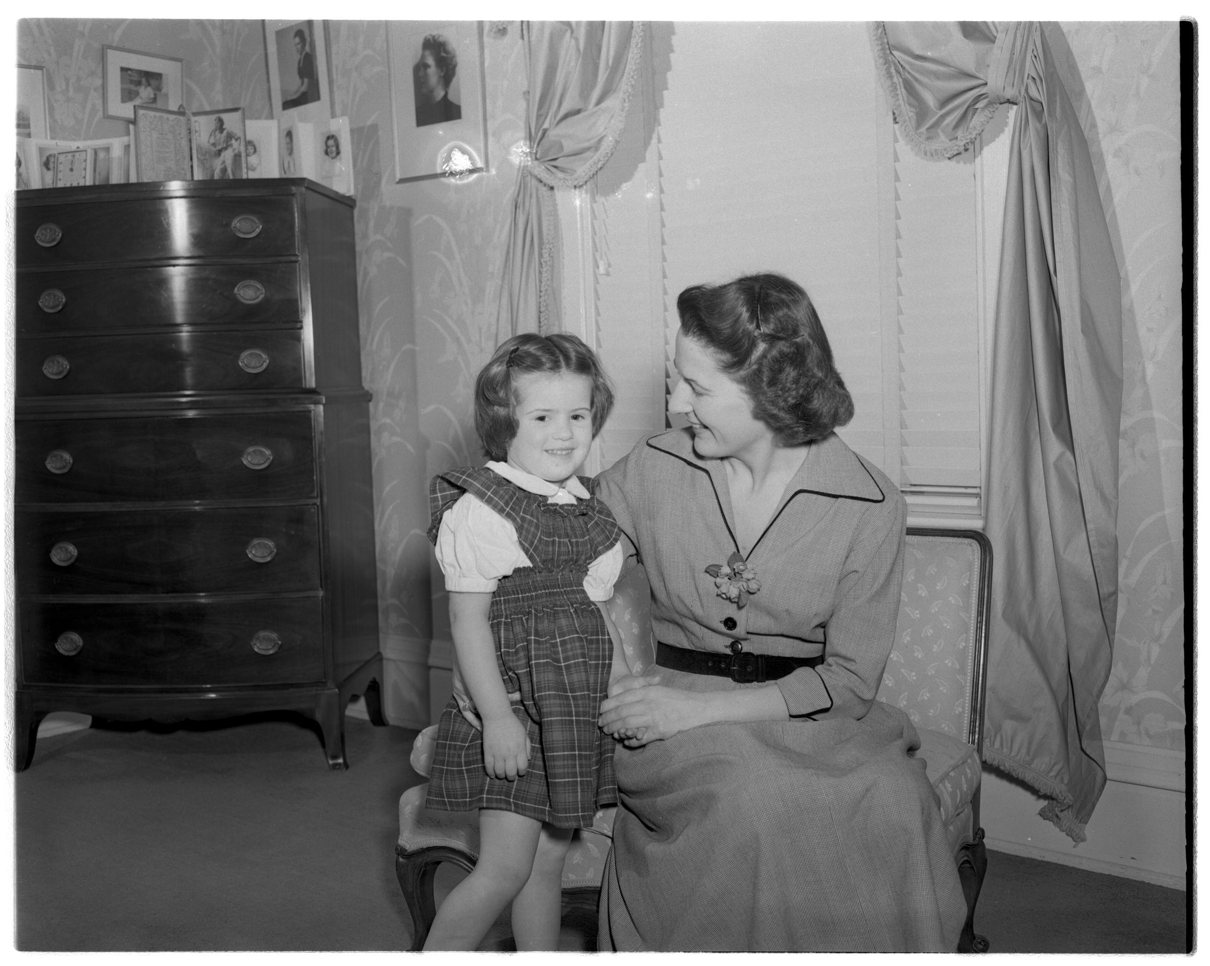 Negative, sheet film. 4 x 5 b&w. No. 2656. Margaret Gradie Schmidt Runnalls and daughter Susan at Schmidt House.