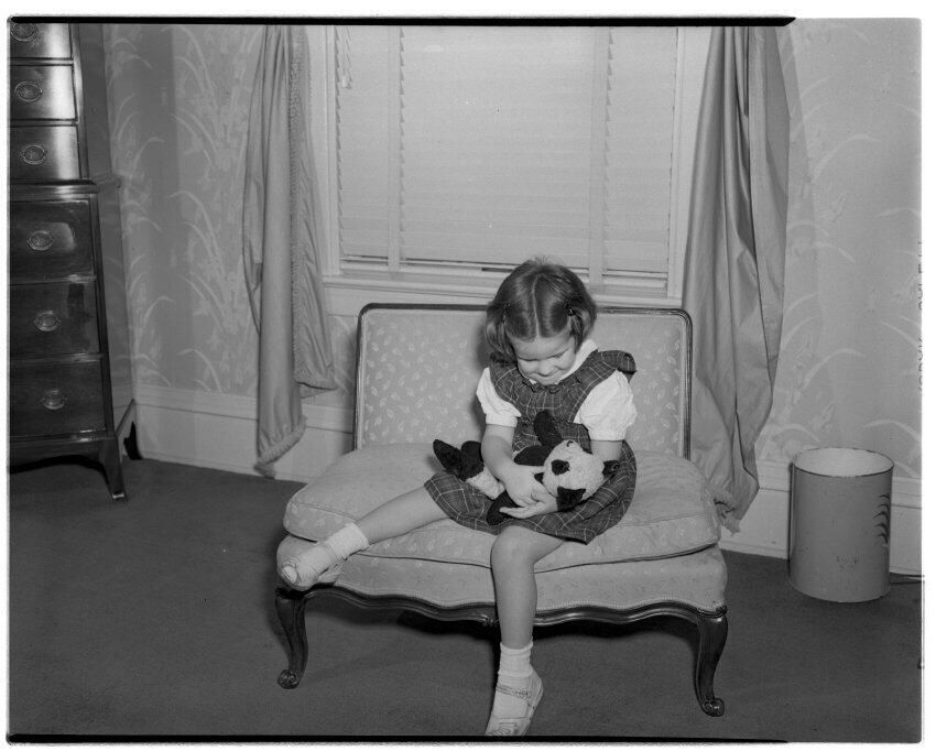 Negative, sheet film. 4 x 5 b&w. No. 2656. Susan Patty Runnalls, daughter of Margaret Gradie Schmidt Runnalls and Johnnie Runnalls, at Schmidt House.
