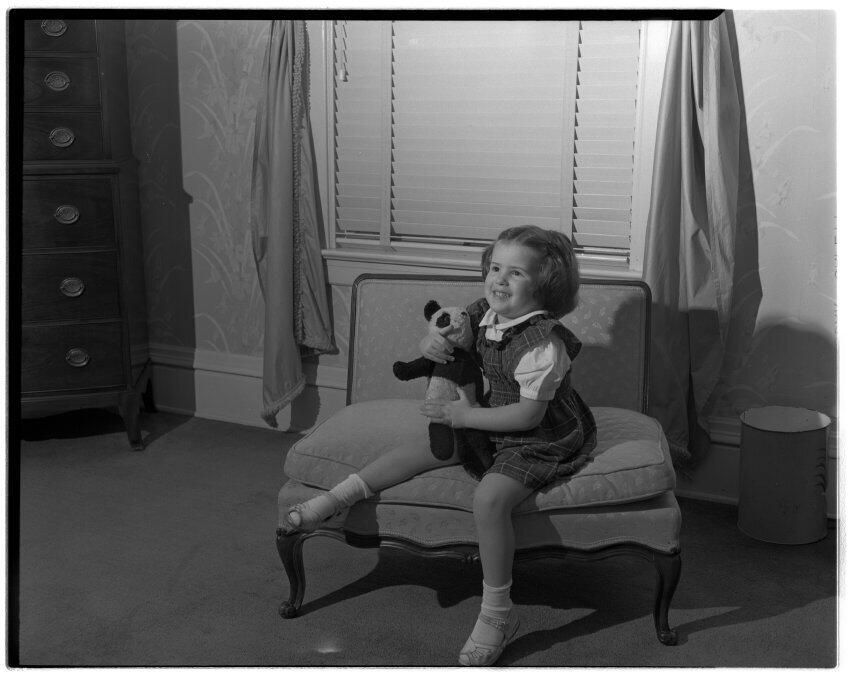 Negative, sheet film. 4 x 5 b&w. No. 2656. Susan Patty Runnalls, daughter of Margaret Gradie Schmidt Runnalls and Johnnie Runnalls, at Schmidt House.