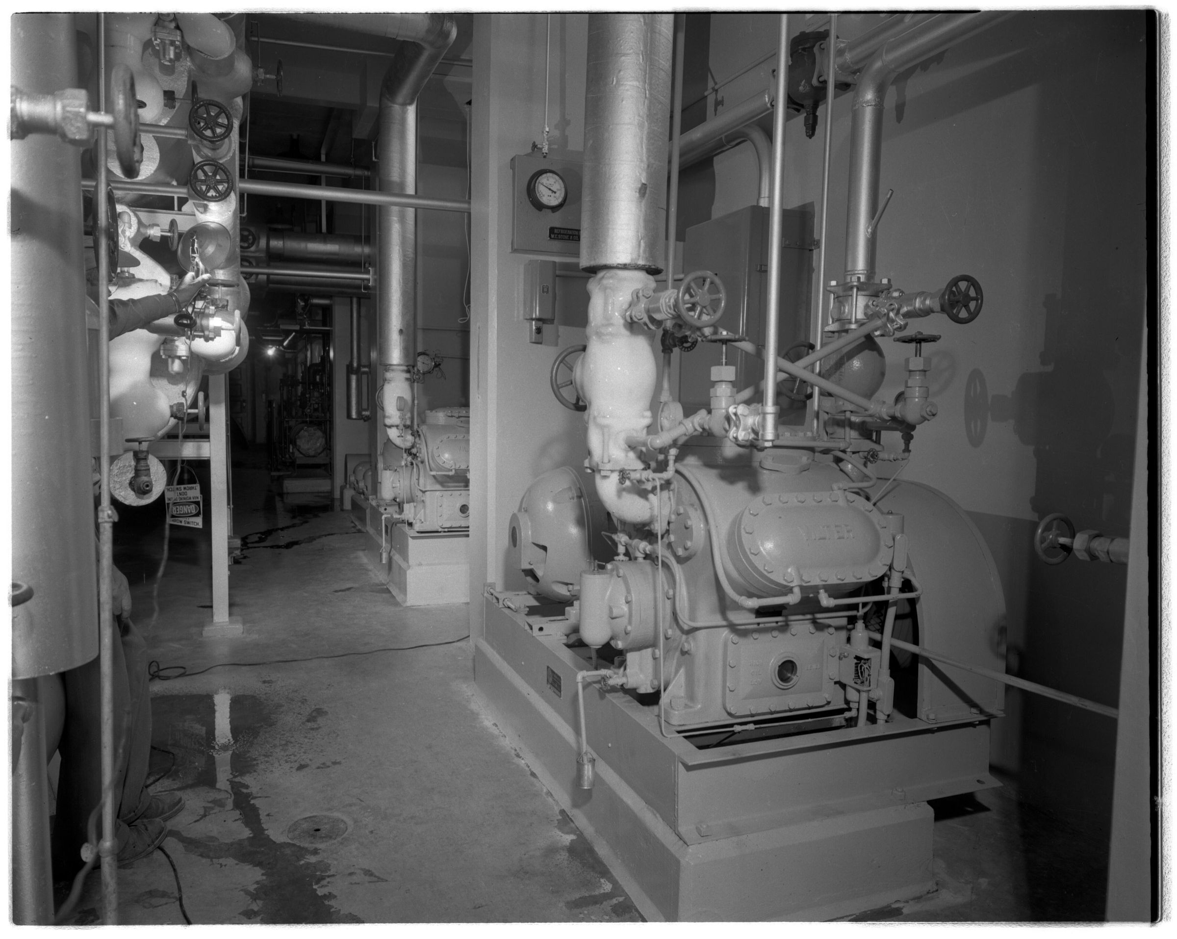 Negative, sheet film. 4 x 5 b&w. No. 676. W. E. Stone and Co. 1330 Dearborn St. Seattle. Refrigeration Plt. at Oly Brewery. One of several ammonia compressors in M-2 cellar. Ammonia was used to cool CO2 to a liquid state for storage. CO2 was then used to carbonate the beer and to displace oxygen in tanks.Name/Title