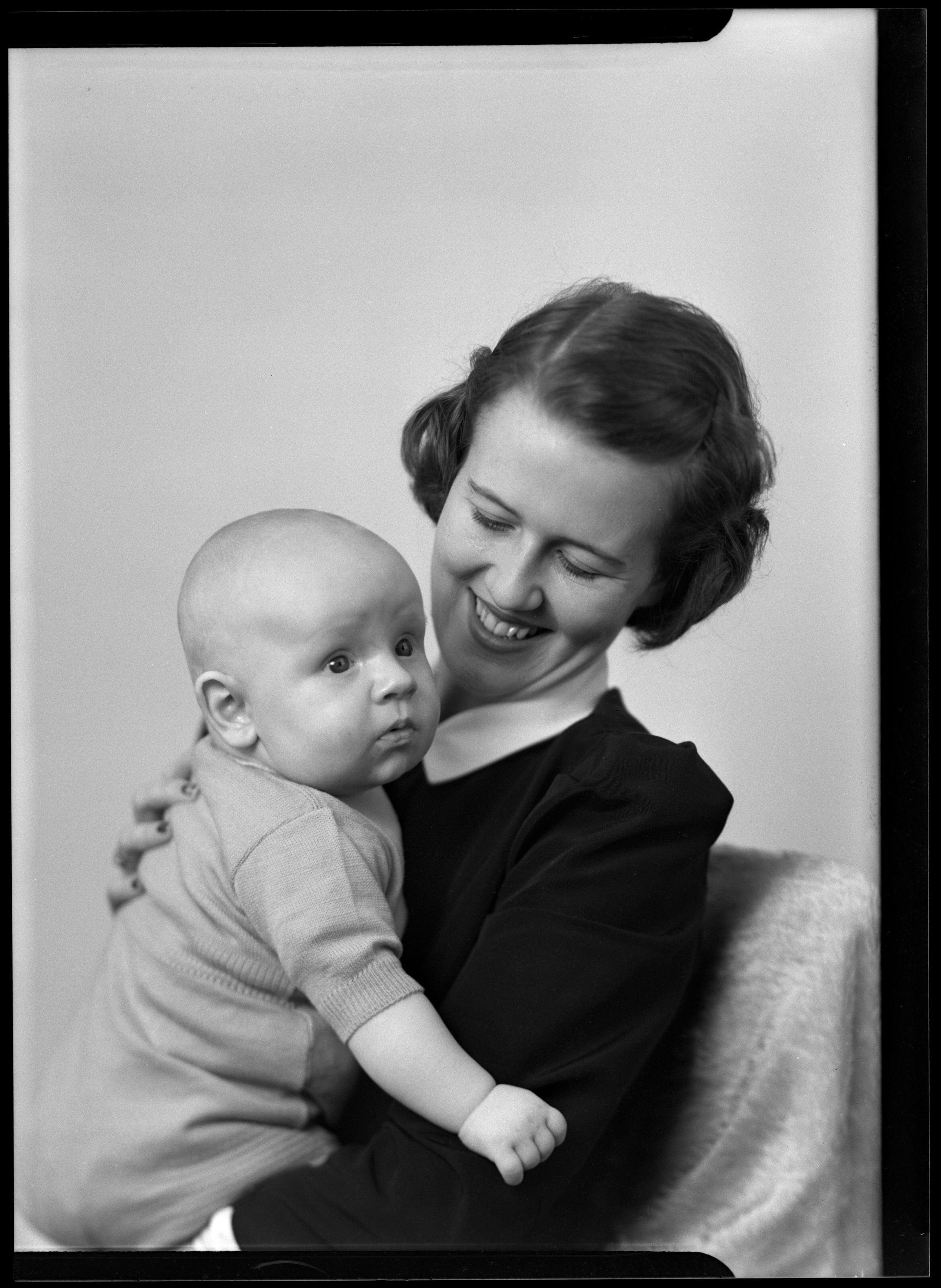 Negative, sheet film. 5 x 3 b&w. No. 5653. Waynette Schmidt, wife of Bump Schmidt, with one of their children.
