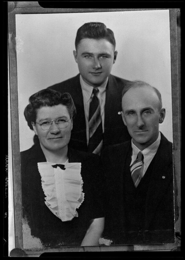 Negative, sheet film. 5 x 3.5 b&w. Mr. and Mrs. Clayton C. Schmidt and son. Olympia brewery employee, unrelated to Schmidt family.