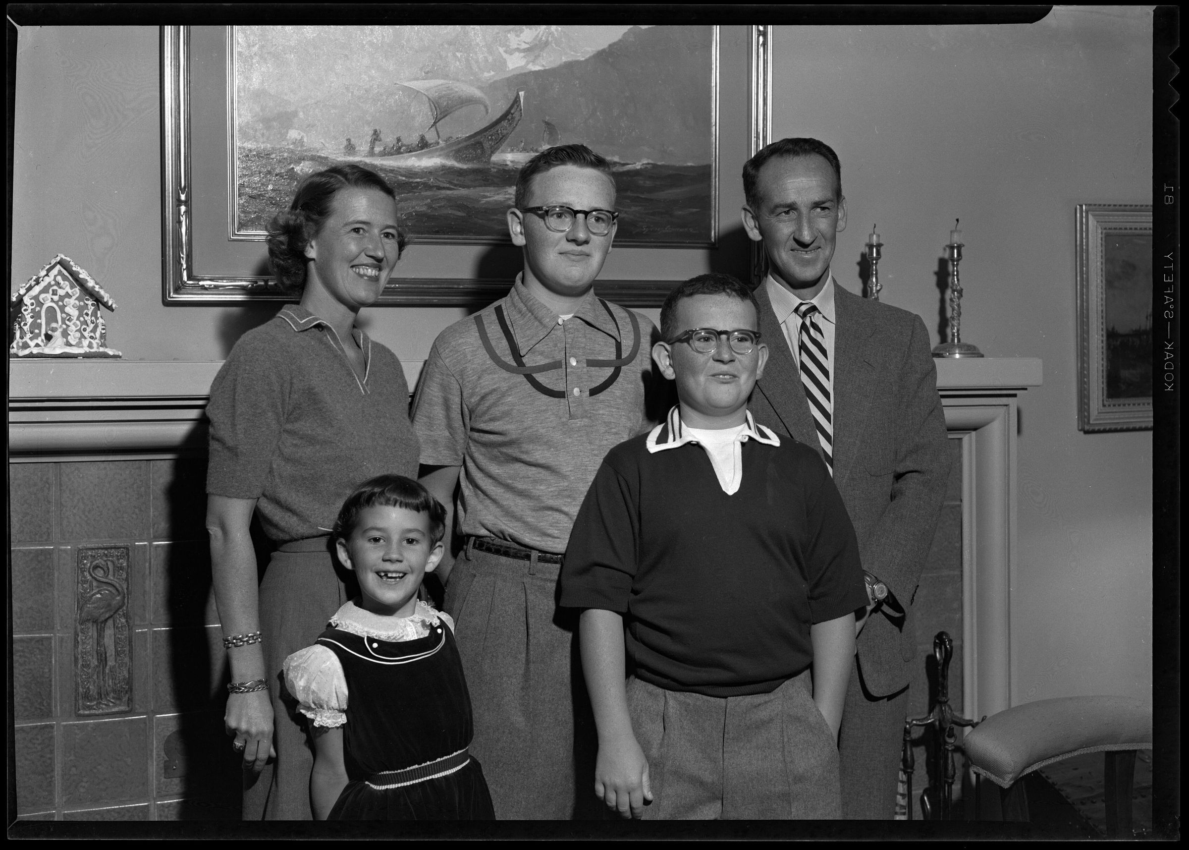 Negative, sheet film. 5 x 7 b&w. No. K 59. Mrs. Adolph Schmidt. Christmas group. Order finished Sat Feb 2. Bump and Waynette family, Christmas photo, taken at Winifred Schmidt's house. Left to right: Waynette, Susan, Rick, Michael, Bump.Name/Title
