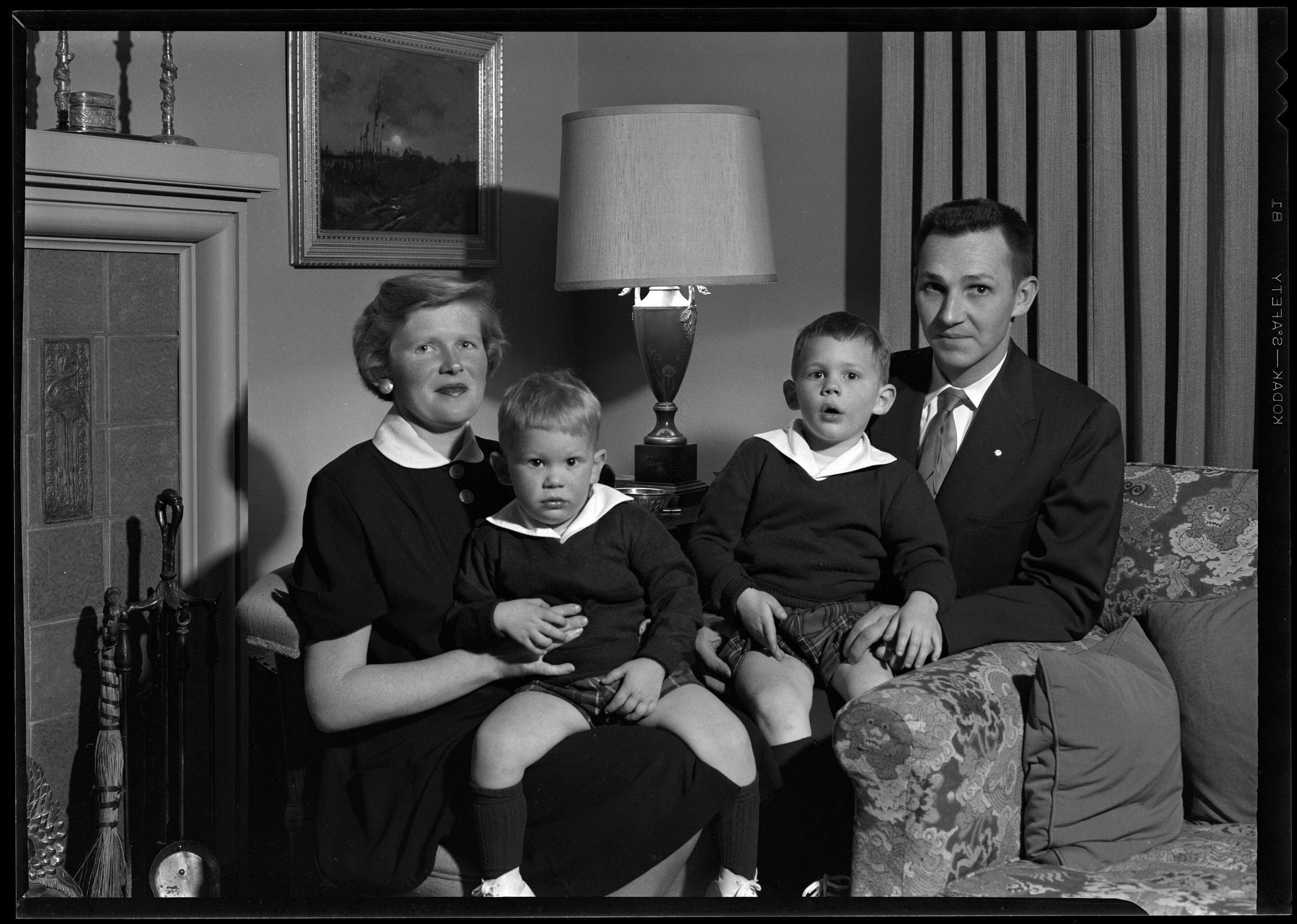 Negative, sheet film. 5 x 7 b&w. No. K 59. Mrs. Adolph Schmidt. Christmas group. Order finished Sat Feb 2. Ruth and Skip Schmidt family, Christmas photo, taken at Winifred Schmidt's house. Left to right: Ruth, Dan, Hank, Skip.Name/Title