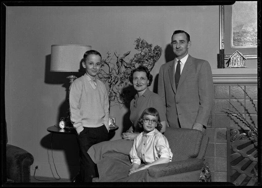Negative, sheet film. 5 x 7 b&w. No. K 59. Mrs. Adolph Schmidt. Christmas group. Order finished Sat Feb 2. Bink and Virginia Schmidt family, Christmas photo, taken at Winifred Schmidt's house.
