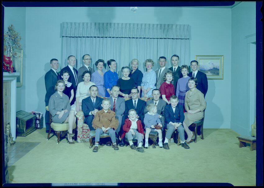 Negative, sheet film. 5 x 7 color. No. O645. Family group at Winifred Schmidt home in color.