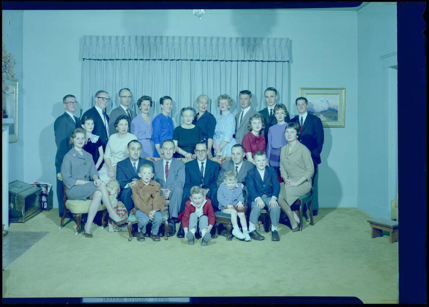 Negative, sheet film. 5 x 7 color. No. O645. Family group at Winifred Schmidt home in color.