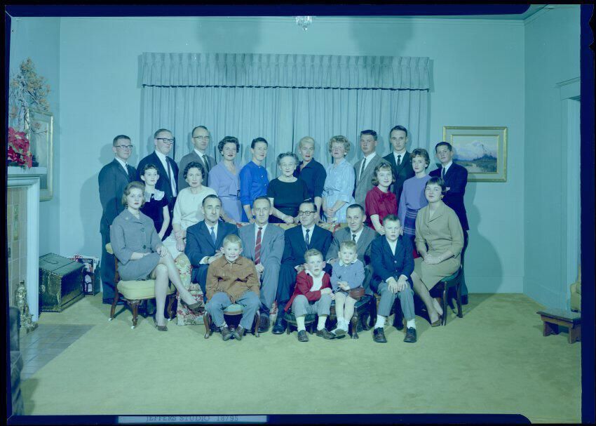 Negative, sheet film. 5 x 7 color. No. O645. Family group at Winifred Schmidt home in color.