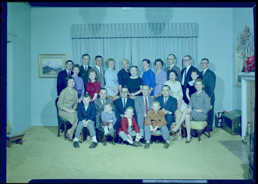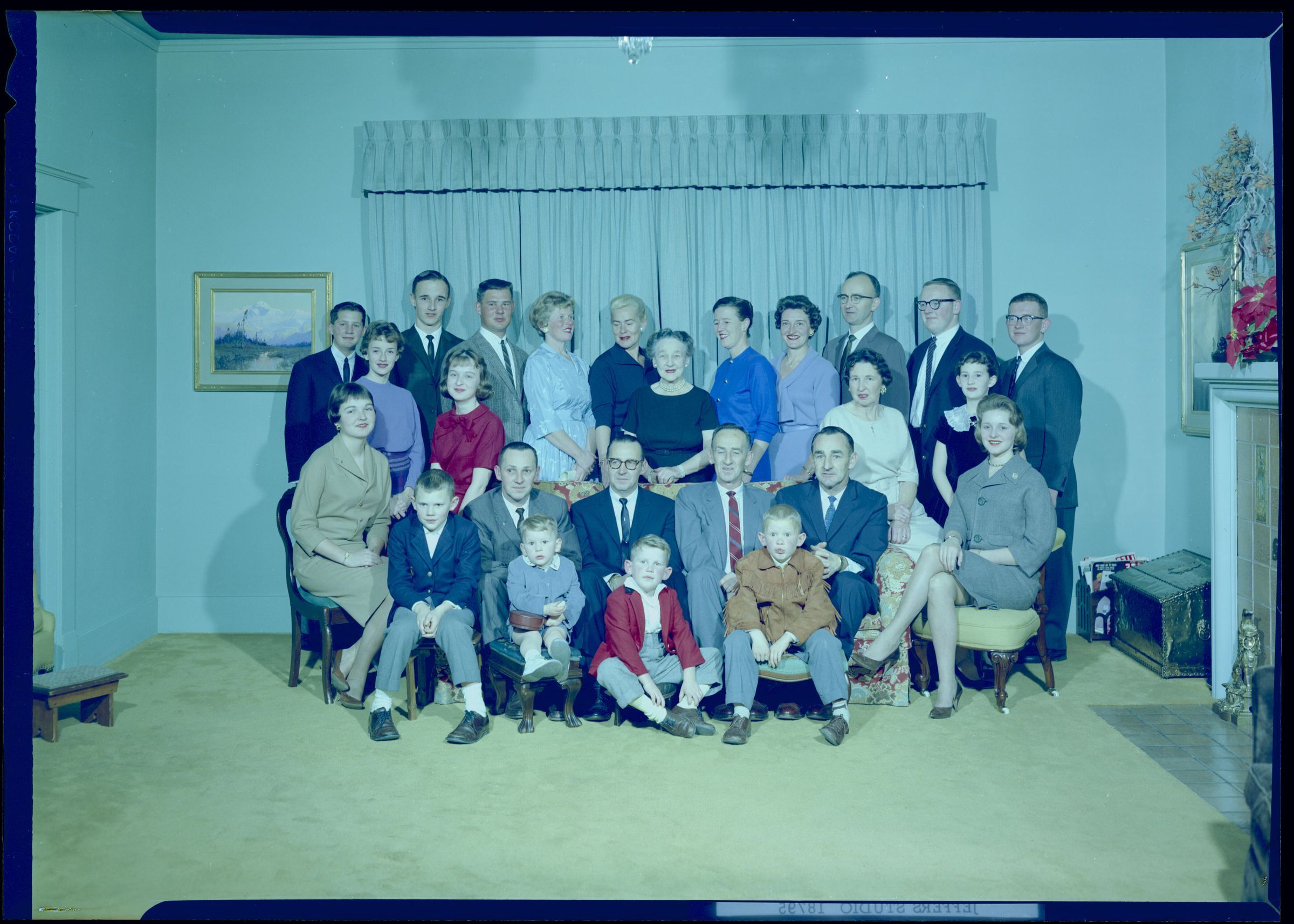 Negative, sheet film. 5 x 7 color. No. O645. Family group at Winifred Schmidt home in color.