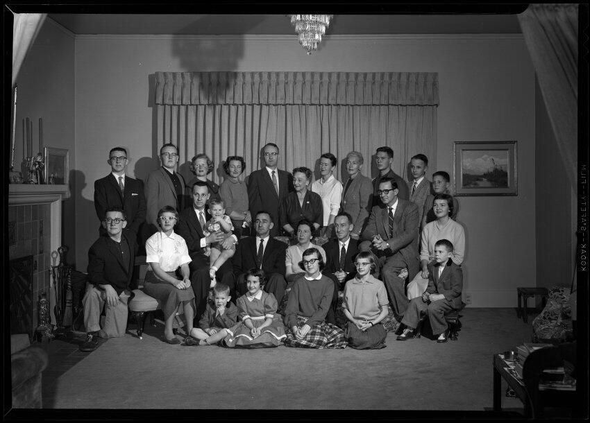 Negative, sheet film. 7 x 5 b&w. No. L772. Christmas photo at Winifred Schmidt's house.