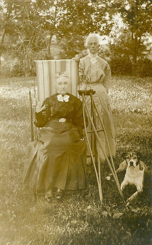 Black and white postcard with two elderly women. One is sitting on a chair-swing with a striped cloth back. She is holding two crutches in her left hand and the swing side in her right. She is wearing a dark dress with a white bow around her neck and a belt buckle. The other woman is standing slightly behind and to the left (right in postcard) of the chair-swing. She is wearing a lighter colored dress with a lace neckline and three white buttons down the front. There is a dog laying to the left (right in postcard) of the crutches. They appear to be posed in a clearing with brush and trees in the background.Collection